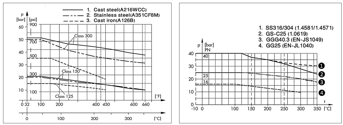 На данных диаграммах, построенных в соответствии со стандартами DIN и ANSI, показаны различные характеристики и давления в зависимости от температуры в разных материалах.