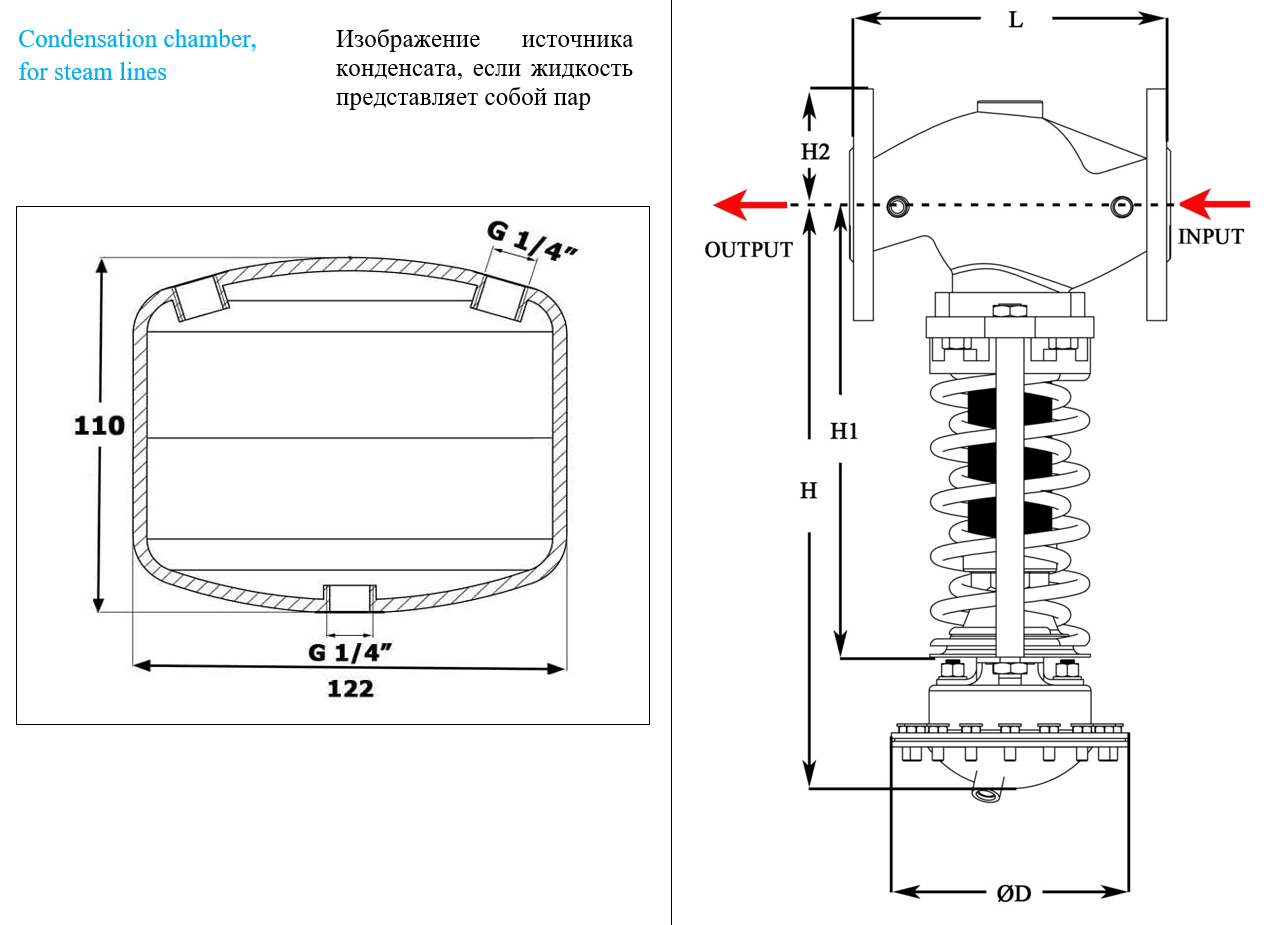 Источник конденсата: Источник конденсата используется для защиты диафрагмы от повышения температуры и прямого воздействия пара, а также для обеспечения правильного функционирования диафрагмы. Перед использованием клапана регулирования давления источник конденсата необходимо заполнить водой.