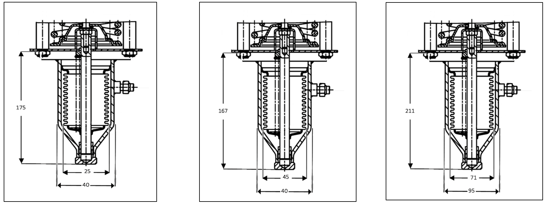 Ниже представлены (металлические) приводы с сильфонами трех различных размеров, которые производятся в компании «Эйваз». Эти приводы можно использовать для управления и снижения давления, когда жидкость имеет коррозионные эффекты, или снижения выходного давления для тех дополнительных диапазонов, которые можно использовать с приводом с диафрагмой. Эти типы приводов полезны для управления диапазонами 10~22 бар, 150~300 фунтов на кв. дюйм, 20~28 бар, 300~400 фунтов на кв. дюйм. Свяжитесь с отделом продаж, чтобы выбрать размер привода.