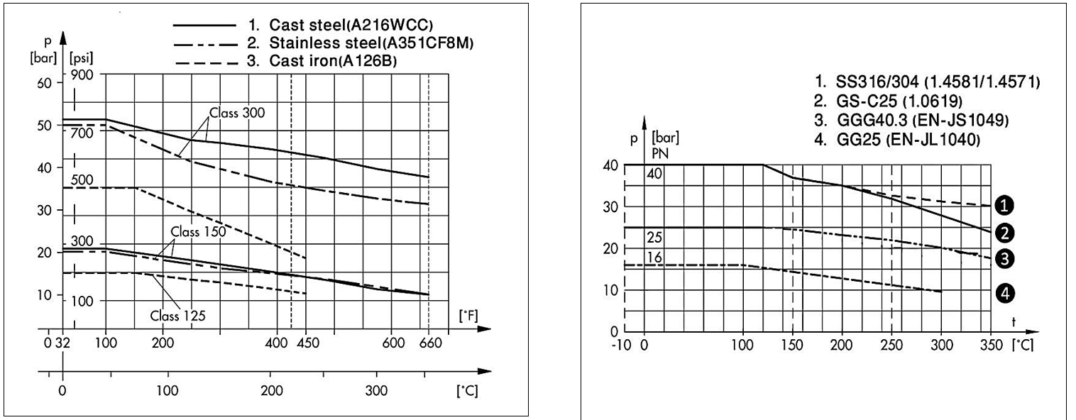 Эти диаграммы построены на основе стандартов DIN и ANSI и показывают различные функции и давление в зависимости от температуры в разных материалах.