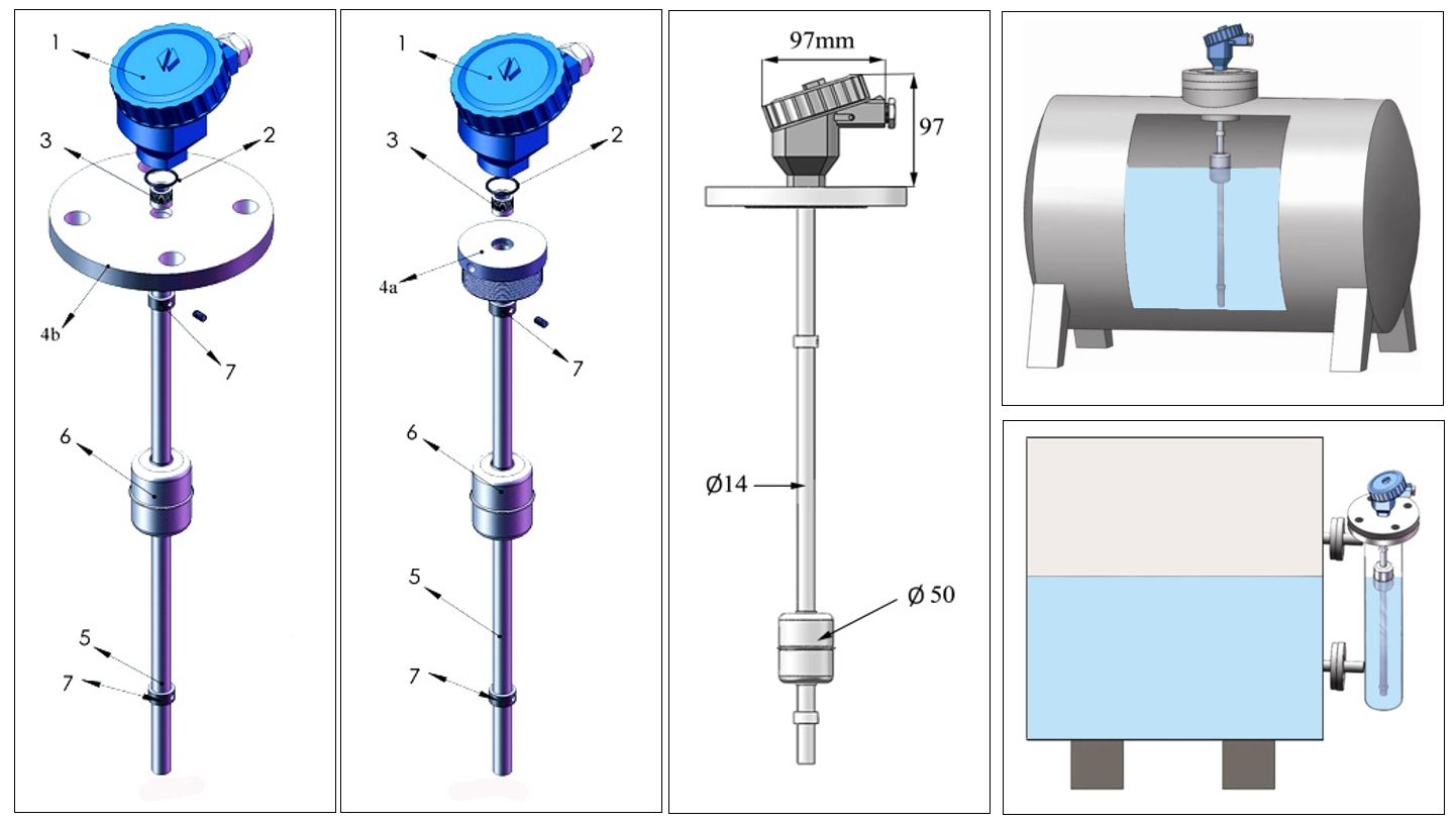 Это оборудование может быть установлено на верхней части резервуаров через резьбовое или фланцевое соединение, где того требуют обстоятельства (например, в подземных резервуарах). Если высота резервуара превышает 1500 мм, на дне резервуара следует установить направляющую, чтобы избежать повреждения трубки в результате турбулентности жидкости или других форм давления. Если требуется боковая установка, MLT 20-21 можно разместить внутри камеры, которая соединена с одной стороной резервуара с помощью двух патрубков.