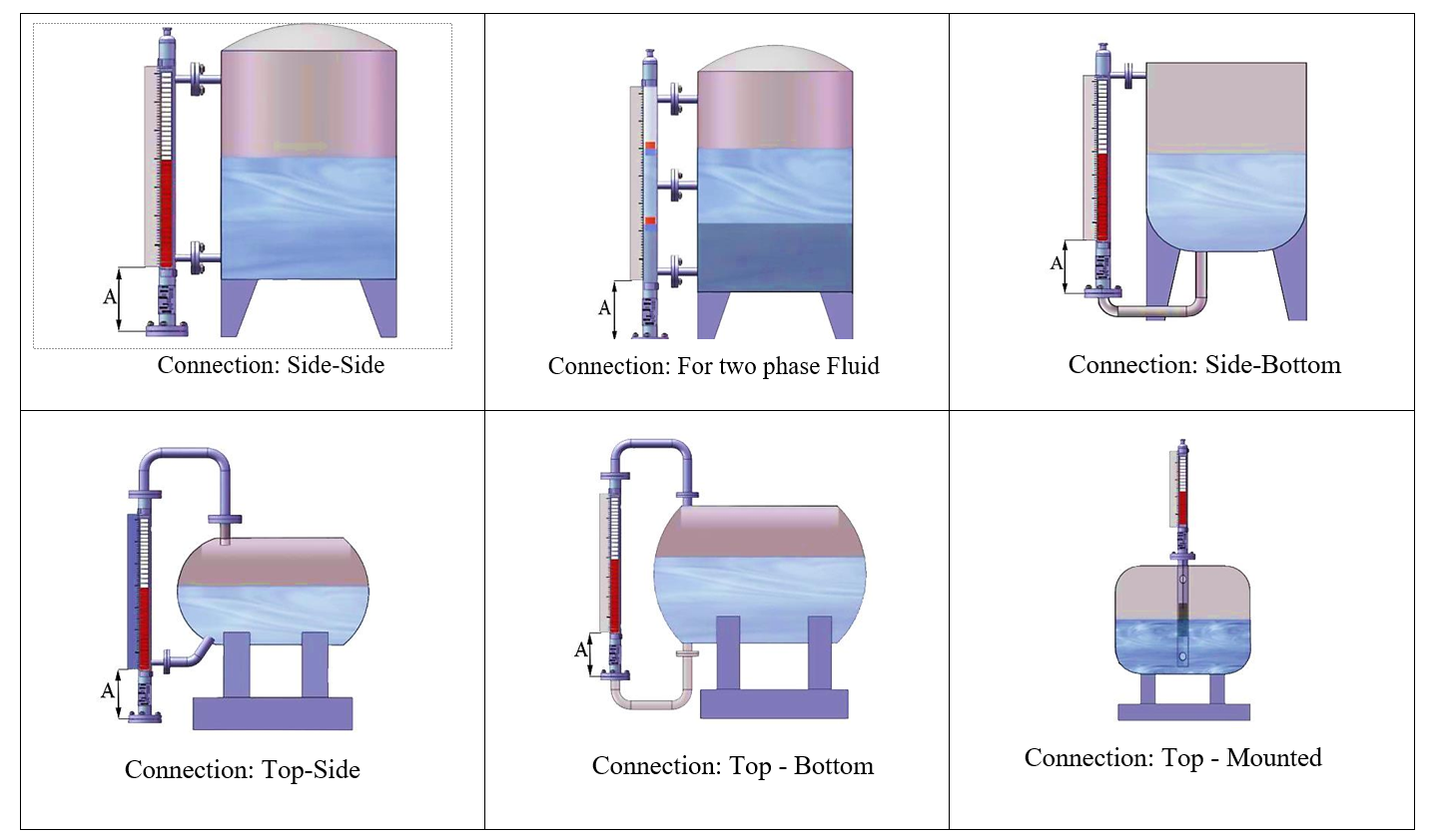 Это устройство устанавливается на резервуарах и других соответствующих местах вертикально от присоединенных фланцев. Чтобы заказать этот продукт, следует учитывать положение резервуара и расстояние первого соединительного фланца от фундамента (A). Если такое расстояние невозможно, необходимо провести согласование с производителем. Если установка устройства сбоку на бок невозможна, может быть изготовлена конструкция с верхним монтажом. Ниже на рисунках показаны различные типы установки уровнемера.
