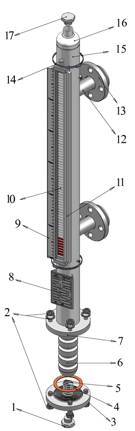 Данное устройство разработано на основе физических принципов, давления жидкостей, электромагнитных свойств, притяжения и отталкивания полюсов. Корпус уровнемера представляет собой трубку, которая соединена с резервуаром вертикально с помощью соответствующих фланцев. Жидкость внутри резервуара направляется в трубку через нижнее сопло за счет поплавка магнитного шара. Когда уровень жидкости изменяется, поплавок перемещается и сталкивается с заслонками, затем меняет их цвет, и, следовательно, можно наблюдать уровень жидкости в резервуаре. Используя датчики, которые установлены на этом устройстве, требуемые команды напрямую отправляются на его основные электрические панели или с другой электронной панелью, уровень жидкости внутри резервуаров может контролироваться и фиксироваться на небольшой высоте автоматически путем запуска и остановки электронасосов подачи, или на этом устройстве может быть установлен датчик уровня и отправлять выходной ток (4...20 mА) или (0...10V) на ПЛК, чтобы видеть и контролировать уровень жидкости в различных положениях.