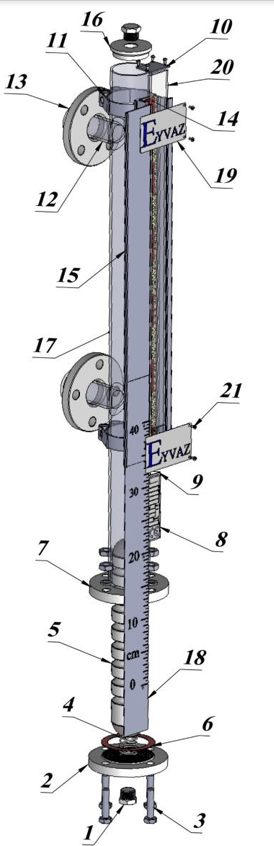 Это устройство было разработано на основе физических принципов, давления жидкостей, электромагнитных свойств, притяжения и отталкивания полюсов. Корпус уровнемера представляет собой трубку, которая соединена с резервуаром вертикально с помощью соответствующих фланцев. Жидкость внутри резервуара направляется в трубку через нижнее сопло, и это заставляет поплавок магнитного шарика. Когда уровень жидкости изменяется, поплавок перемещается и сталкивается с заслонками, затем меняет их цвет, и, следовательно, можно наблюдать уровень жидкости в резервуаре. Используя датчики, которые установлены на этом устройстве, требуемые команды напрямую отправляются на его основные электрические панели или с другой электронной панелью, уровень жидкости внутри резервуаров может контролироваться и фиксироваться на небольшой высоте автоматически путем запуска и остановки электронасосов подачи, или на этом устройстве может быть установлен датчик уровня и отправлять выходной ток (4…20 mА) или (0…10 V) на ПЛК, чтобы видеть и контролировать уровень жидкости в различных положениях