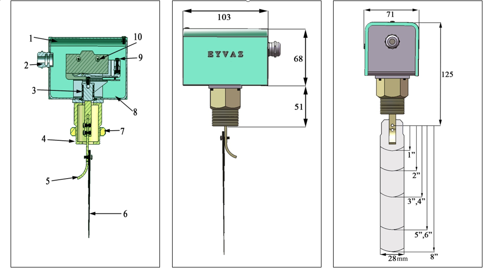 Переключатель уровня типа LFS 20-72 имеет резьбовое соединение 1”, устанавливается сверху трубопроводов (вертикально) с помощью гнезда или втулки размером 1”.