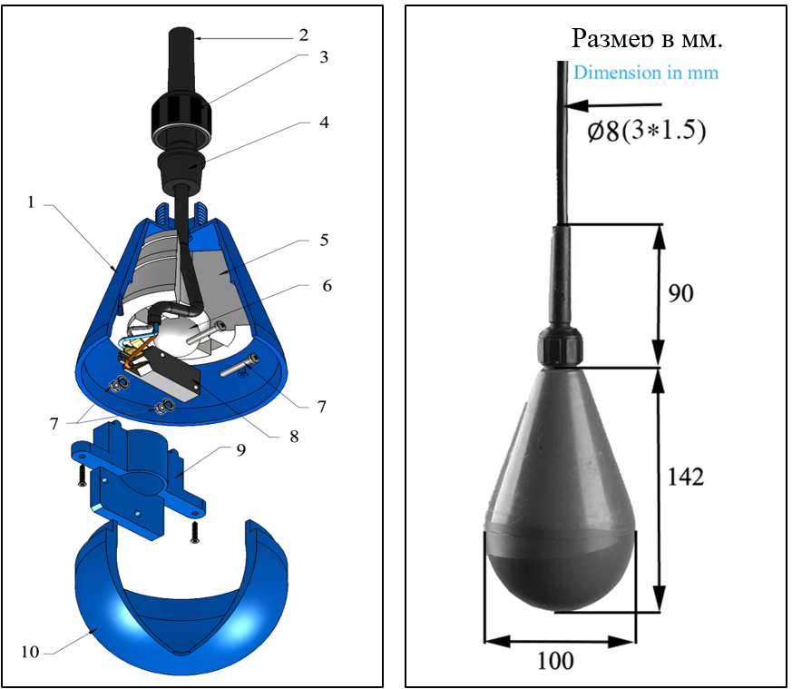 Функция PLS 20-10 основана на электромеханике. Он разработан для простого управления и состоит из поплавкового шарика из полипропилена и специального кабеля из ПВХ. Это устройство подвешивается к месту, где вы хотите контролировать жидкость (макс. 40 м в жидкости). При увеличении и направлении уровня жидкости к устройству, положение поплавка изменяется и становится горизонтальным. В результате этого стальная дробь, которая обычно находится на рычаге концевого выключателя, отключается и передает переключатель. На PLS 20-10 подготовлен грузило, предотвращающее всплывание шарика, пока уровень жидкости повышается. Всякий раз, когда уровень жидкости понижается, эта функция инвертируется. Таким образом, концевой выключатель посылает команды ВКЛ-ВЫКЛ в электрические цепи для управления насосами и сигнальными устройствами. Все пластиковые детали привинчены или приварены
