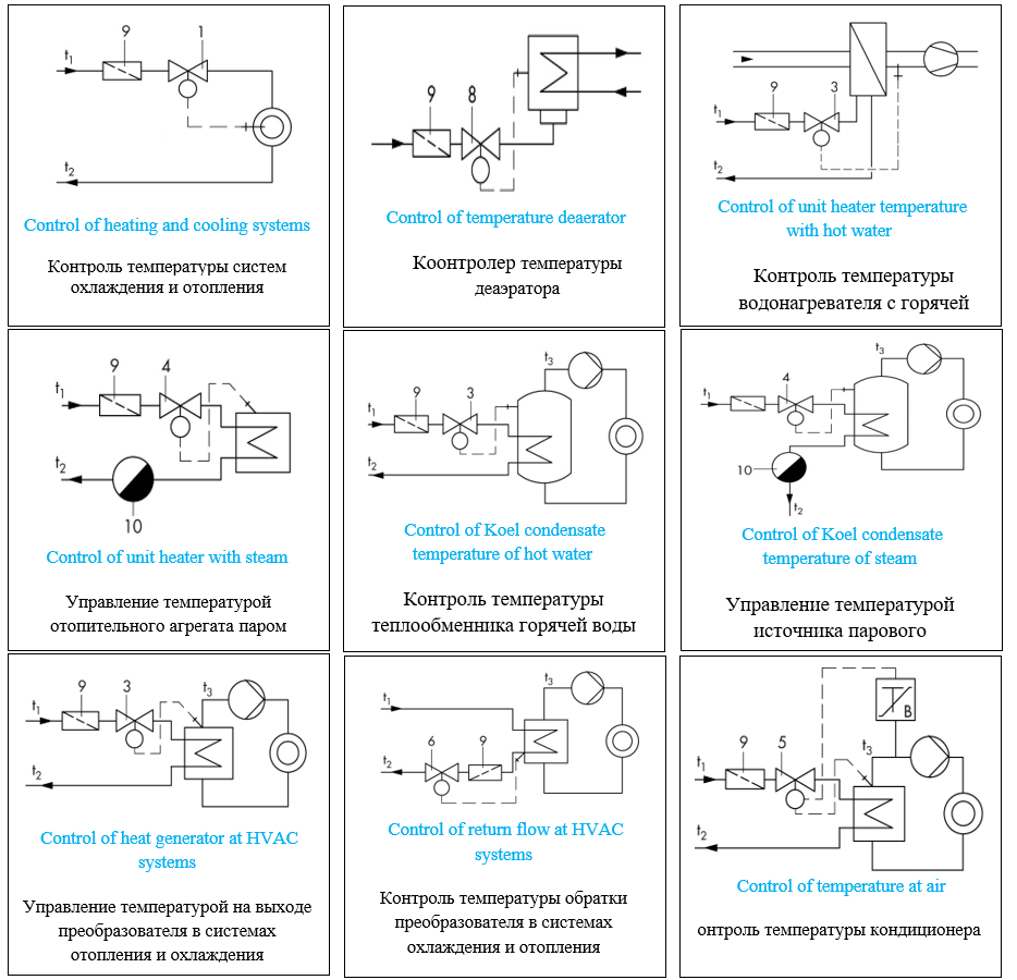 Клапан автоматического регулирования температуры используется для регулирования температуры трубопроводов или резервуаров в системах отопления и охлаждения. Датчик этого клапана регулируется в диапазоне от -10°C до 150°C или от -50°F до 302°F. Размер клапана составляет от DN15 до DN100 или от 1/2 дюйма до 4 дюймов, он производится с номинальным давлением от PN16 до PN40 или классом № 150 и классом № 300 и максимальной рабочей температурой 220°C или 428°. F и на основе стандартов DIN или ANSI.