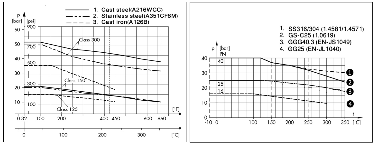 На этих диаграммах, построенных в соответствии со стандартами DIN и ANSI, показаны различные характеристики и давления в зависимости от температуры в разных материалах.