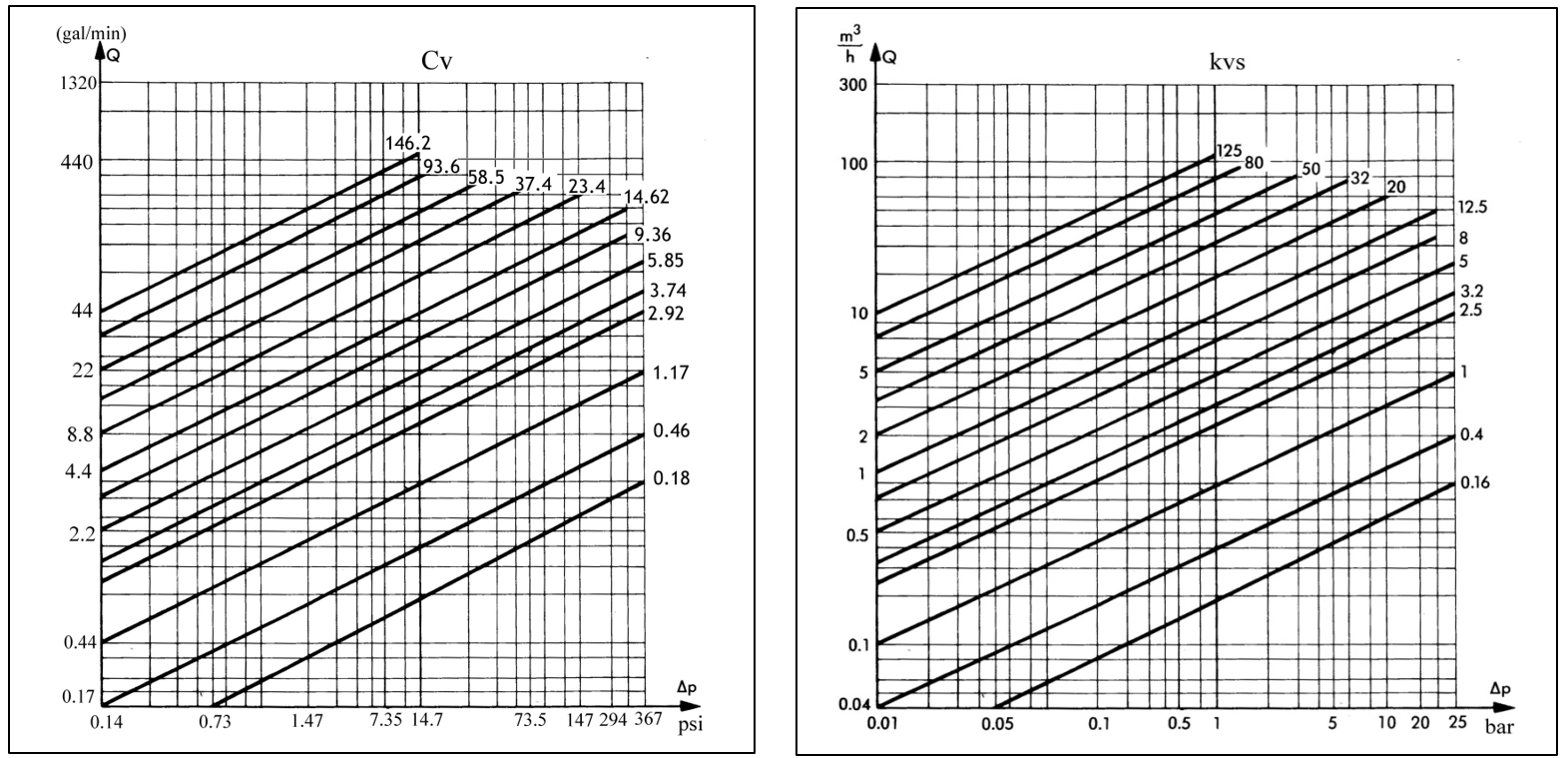 На этой диаграмме (которая предназначена для водной жидкости) в зависимости от PΔ и требуемого расхода Q получается CV. Имея резюме и используя таблицу технических характеристик, вы сможете найти необходимый размер клапана.