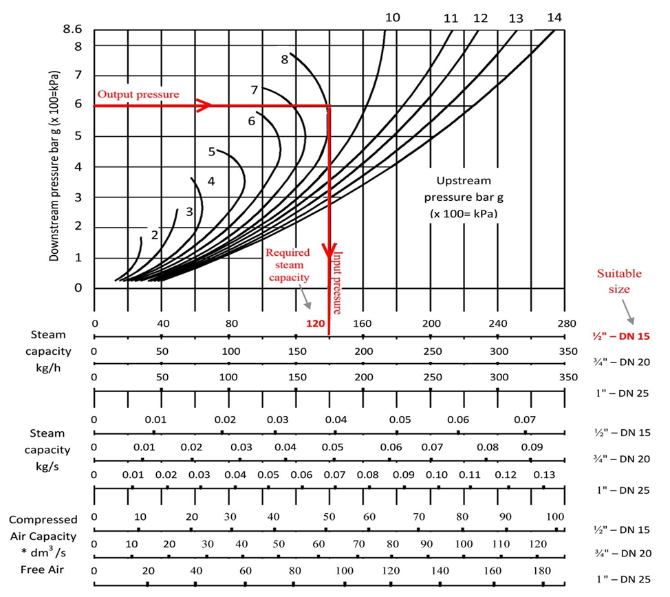 Кривые линии, обозначенные 2, 3 и т.п. представляют входное давление. Выходное давление считывается по вертикальной линии с левой стороны таблицы. Когда входное и выходное давление определены, проведите горизонтальную линию от выходного числа давления до кривой входного числа давления и проведите вертикальную линию от их точки пересечения до нижней таблицы. Вы можете определить размер клапана в соответствии с требуемой паропроизводительностью и показателями паропроизводительности, которые указаны под таблицей.