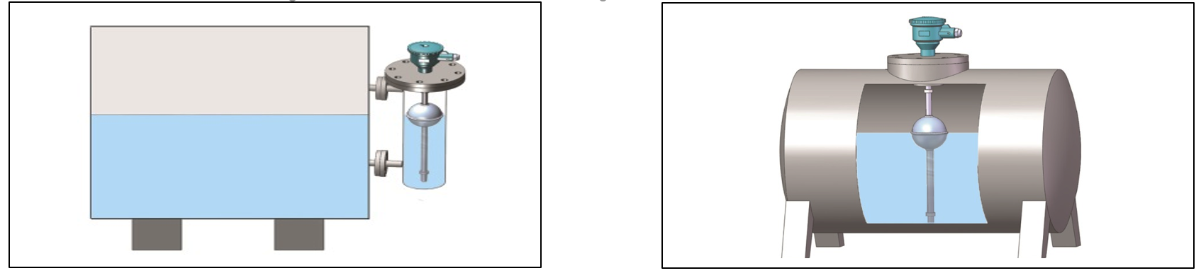 В случаях, когда резервуары установлены под землей или в особых требуемых условиях, устройство устанавливается на верхней стороне резервуаров с помощью фланцевого соединения. Чтобы избежать повреждения жидкости турбулентностью стержня, на дне резервуара может быть установлена направляющая (в случаях, когда высота резервуара превышает 200 мм). Камера может быть установлена на приеме, тогда MLS 20-08 устанавливается на этой камере, когда он устанавливается сбоку резервуара с помощью двух сопел.